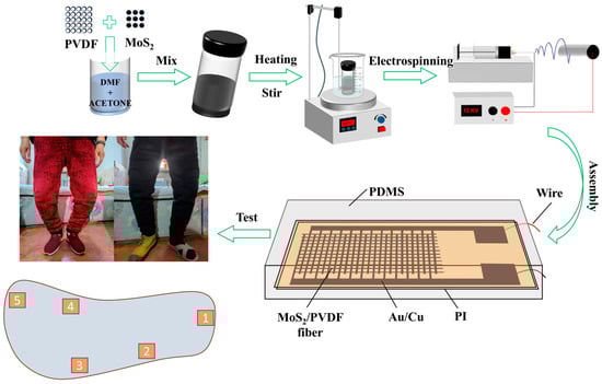 MoS2/PVDF composite nanofiber film was used as the piezoelectric layer, an interdigital electrode was used as the electrode, and PI was used as the flexible MoS2/PVDF composite sensor substrate. We then cut the composite nanofiber membrane and the PI membrane (composite membrane working area of 1 × 1.5 cm2) and placed the interdigitated electrode on the underside of the composite nanofiber membrane as the electrode and the PI membrane as the upper cover. Then, in order to prevent contamination of the composite sensor, the composite sensor was encapsulated using PDMS. Finally, in order to avoid the triboelectric of the surrounding environment, the composite sensor was subjected to a certain pressure, and the sensor equipment was tightened by eliminating the distance between different materials. The preparation of the sensor is shown in Figure 1.