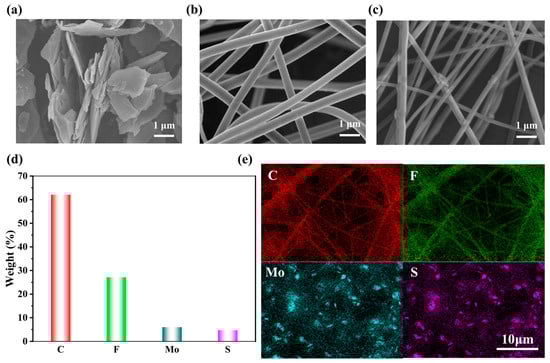 The energy-dispersive X-ray spectroscopy (EDS) maps of the MoS2/PVDF composite nanofiber mats are shown in Figure 2d,e. In these images, the presence of C, F, Mo, and S elements can be observed, with C and F dominating. The uniform distribution of Mo and S elements in Figure 2e indicates that MoS2 has been uniformly dispersed into the PVDF solution. These results demonstrate the successful preparation of MoS2/PVDF composite nanofiber mats.