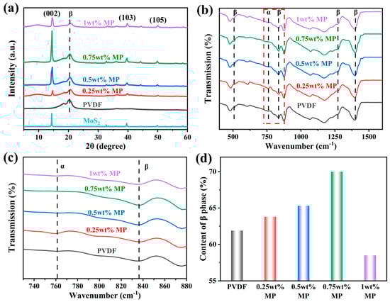 (a) XRD patterns, (b,c) FT-IR spectra, and (d) β-phase content.