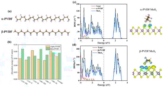 Subsequently, density of states (DOS) analyses were carried out for both the α-phase and β-phase in conjunction with MoS2 (Figure 5c,d). It was observed that the DOS overlap between the β-phase and MoS2 is more pronounced. Below Fermi level, the β-phase has a stronger peak intensity than that of the α-phase, and the β-phase is closer to the Fermi level. This band feature facilitates more efficient charge transfer between the β-phase and MoS2 compared to the α-phase, leading to a stronger binding affinity. This point has been confirmed by the charge transfer between PVDF and MoS2, as displayed in Figure 5c,d. These findings substantiate that MoS2 promotes the growth of the β-phase.