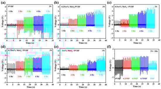 Output voltages of (a) PVDF, (b–e) MoS2/PVDF composite sensor at different content of MoS2 (0.25, 0.5, 0.75, and 1 wt%), and (f) output voltage of PVDF and MP at 3 N and 3 Hz.