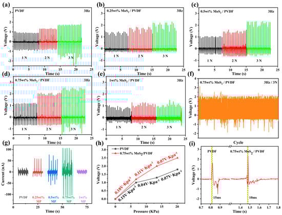 Output voltages of (a) PVDF and (b–e) MP at 3Hz, (f) durability testing of MoS2/PVDF composite sensor, (g) output current of sensors at different concentrations, (h) sensitivity, and (i) response time of PVDF with 0.75 wt% MP sensor.