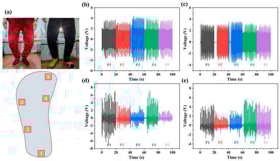As illustrated in Figure 9a, we applied the sensors to five key points on the foot (labeled as points 1–5) to monitor the foot pressure distribution during walking for both elderly and young individuals. Through comparative gait analysis, our findings lead us to conclude the following key observations, as detailed in Figure 9b–e. Elderly individuals exhibit a slower walking pace and lower step frequency compared to younger adults. The foot pressure distribution in the elderly is more dispersed, with a particularly prominent pressure peak at point 3. This may be attributed to leg deformities such as genu varum or genu valgum, which cause a shift in the center of gravity and increase the load on the arch region. Compared to younger individuals, the elderly have relatively lower peak pressures, and their pressure distribution is more uniform across the foot. In contrast, young individuals exhibit concentrated foot pressure primarily at point 1 and point 4. This indicates a more natural gait pattern, with pressure distribution that aligns with normal biomechanical principles. Young individuals walk at a faster pace and higher step frequency, resulting in more rapid changes in foot pressure. This study provides foundational data for gait analysis and elderly health management strategies.