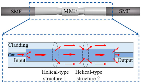 Figure 1 illustrates the STMS fiber structure, where the STMS fiber structure is configured by fusion splicing a short section of multimode fiber (MMF) with two helical-type structures between two single-mode fibers (SMFs). The MMF section incorporates two helical-type structures, which together form a Mach–Zehnder Interferometer (MZI) configuration. In the initial helical-type structure, higher-order modes from the multimode fiber (MMF) core propagate into the MMF cladding. These modes then propagate through the cladding region between the two helical structures before being coupled back into the fiber core at the second helical-type structure. Consequently, the introduction of two helical-type structures enhances the proportion of power in the evanescent field within the MMF cladding region. These configurations not only modify the shear stress but also adjust the local refractive indices within the multimode fiber (MMF). The multimode interference within the MMF section is substantially affected by the presence of both helical-type segments.