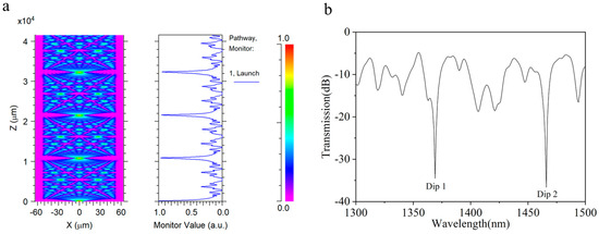 (a) Simulation of optical field distribution of STMS with two helical−type structures using BPM. (b) Simulated transmission spectrum of the STMS fiber structure.