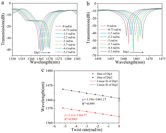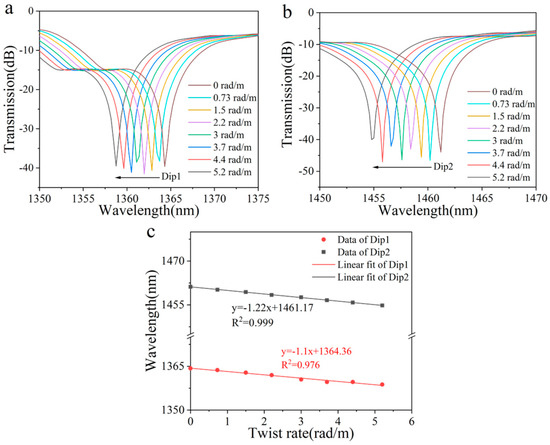 Subsequently, a detailed simulation was conducted to investigate the sensor’s response under clockwise torsion. As shown in Figure 3a,b, the twist rate ranged from 0 to 5.2 rad/m, inducing a blue shift in the wavelengths of the two peaks. This blue shift became increasingly significant with an increase in the torsion rate. Furthermore, the wavelength variations in the two peaks exhibited a highly significant linear relationship with the changes in the twist rate, as depicted in Figure 3c. Following the fitting process, the torsion sensitivities of the two peaks were determined to be −1.1 nm/rad·m−1 and −1.22 nm/rad·m−1, respectively.