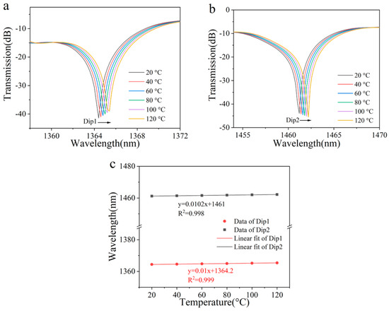 (a) Simulated transmission spectrum evolution of Dip 1 and (b) Dip 2 with increased temperature. (c) Linear fitting results of the resonant wavelength shift versus temperature.