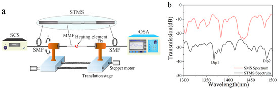 (a) Illustration of the setup for fabricating STMS fiber structures. (b) Measured transmission spectrum of the SMS and STMS fiber structures.