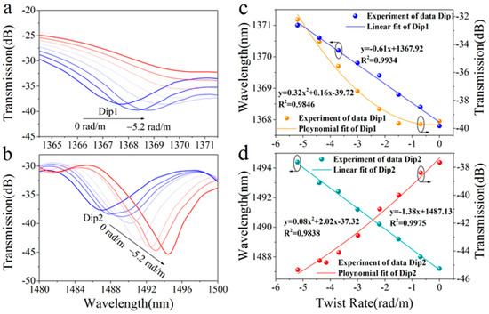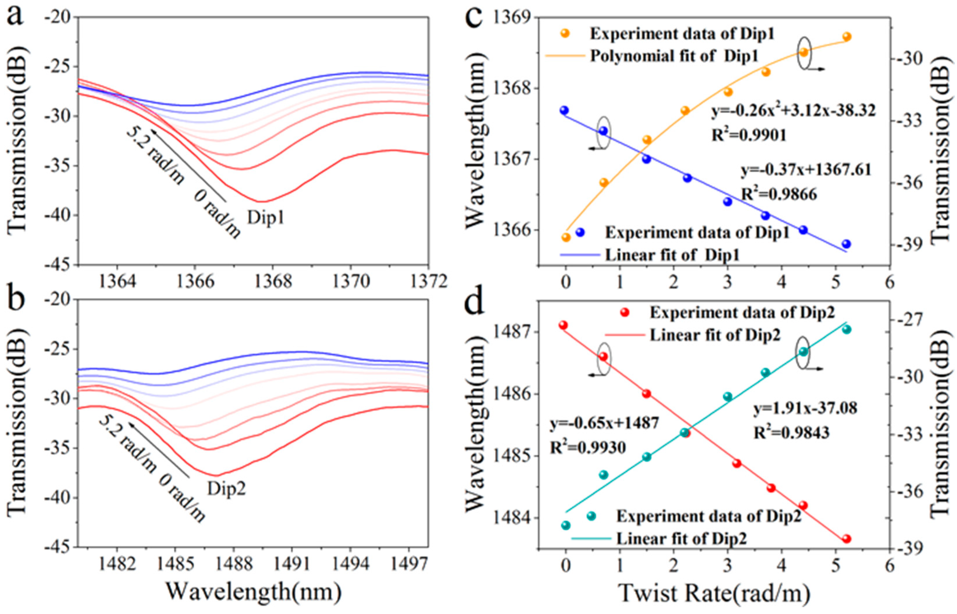 The twisting rate was varied from 0 to −5.2 rad/m with an interval of −0.8 rad/m, and the transmission spectra of the STMS fiber sample were measured and are shown in Figure 8a,b. A contra-directional twist was applied, resulting in a positive change in the effective refractive index difference, as clearly illustrated in Figure 8a,b; this causes the resonance dips to red shift, which increases as the twist rate decreases (becomes more negative). When the twisting rate was varied from 0 to −5.2 rad/m, the resonant wavelength of Dip 1 shifted from 1367.8 nm to 1371.0 nm, and Dip 2 shifted from 1487.2 nm to 1494.4 nm. Simultaneously, the loss of Dip 1 changed from −38.7 dB to −32.2 dB and that of Dip 2 changed from −37.8 dB to −45.3 dB. The calculated and measured wavelength shifts of resonant depths according to the twisting rate are shown in Figure 8c,d. The resonant wavelength and resonant depth maximum twist sensitivities of Dip 1 are −0.61 nm/rad·m−1 and 0.16 dB/rad·m−1, and those of Dip 2 are −1.38 nm/rad·m−1 and 2.02 dB/rad·m−1, respectively.