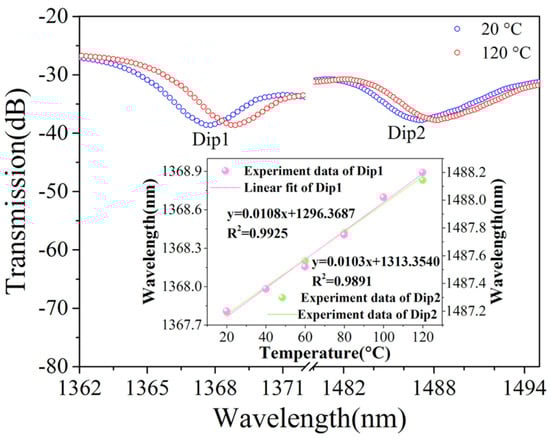 The STMS sample was positioned within a temperature-controlled chamber to assess its thermal dependence. The transmission spectra of the STMS structure, as the temperature ranged from 20 °C to 120 °C, are illustrated in Figure 9. As the ambient temperature escalated from 20 °C to 120 °C, the measured wavelength shifts and resonant depth variation of two dips were only 1 nm and less than 0.1 dB, respectively. To ensure minimal influence from temperature fluctuations and achieve highly accurate twisting rate measurements, the environmental temperature was meticulously maintained at a stable level. Consequently, within a narrow temperature range, the twist sensor can be regarded as effectively temperature-insensitive. As shown in the inset of Figure 9, the temperature sensitivity of the STMS was calculated to be 10 pm/°C within the range of 20 to 120 °C.