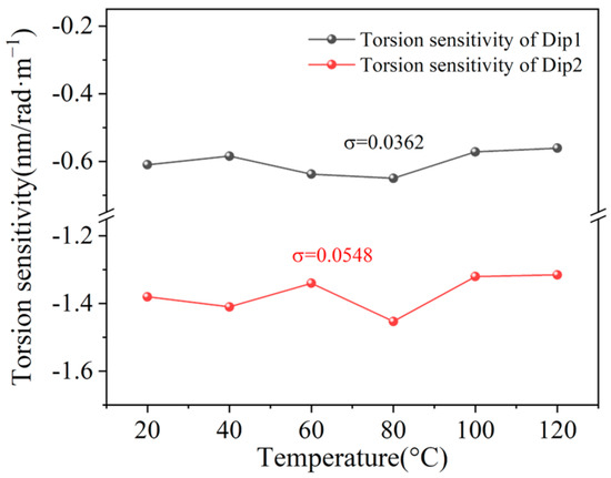 Subsequently, we evaluated the performance of our sensor in terms of availability across different temperatures. The relationships between torsion sensitivity and temperature are illustrated in Figure 10. According to the measured results, the standard deviations σ of the torsion sensitivities of two dips are 0.0362 and 0.0548, respectively. This tiny value of the standard deviation σ indicates that our sensor exhibits a stable response to torsion with a varied ambient temperature.