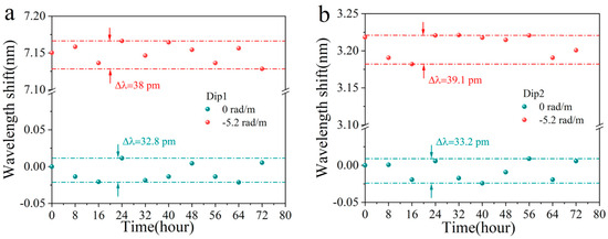 Finally, we verify the stability of the sensor. The sensor was positioned at states of 0 rad/m and −5.2 rad/m respectively, and the relative wavelength shift of the two dips was meticulously recorded every 8 h. Data from ten experiments in each group are presented in Figure 11a,b below. The minor fluctuations in wavelength can be attributed to the interference caused by ambient environmental noise. In these two experiments, the maximum wavelength shifts were measured at 34.1 pm and 38.2 pm respectively, which remain significantly lower than the impact induced by a torsion change of 0.063 rad/m.