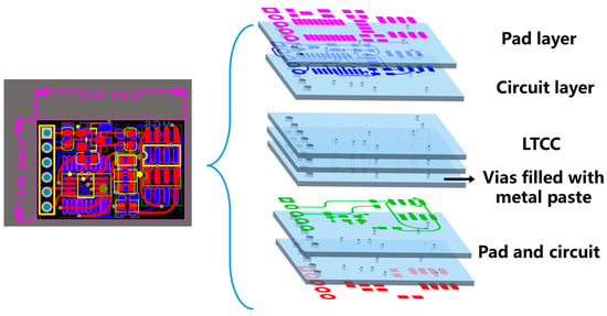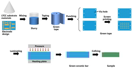 The sensor fabrication process primarily involves the following two steps: the preparation of the multilayer ceramic substrate and the soldering assembly of the surface-mount components. The multilayer ceramic substrate is fabricated using the LTCC process, as shown in Figure 2. The LTCC substrate material and the silver paste are prepared by the Siramic-Tech Co., Ltd., Jinhua, China. Each single-layer green tape has a thickness of 130 µm.
