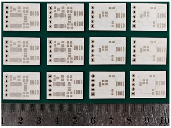 In accordance with the multilayer ceramic circuit design shown in Figure 1, the green tapes are cut and punched, and vias are filled with silver paste. The designed circuit and pad patterns are then printed onto the green tapes using screen printing, as illustrated in Figure 3. The 10 layers of green tape, with vias filled, are laminated at 65 °C and 15 MPa for 20 s to form a multilayer ceramic green bar. This green bar is then heated in a sintering furnace to 450 °C at a rate of 1.5 °C/min, with a two-hour hold to decompose and remove all organic binders. The temperature is then raised to 850 °C within 80 min and held for 30 min to complete the sintering process. The final dimensions of the obtained multilayer ceramic circuit substrate are 20 mm × 13.5 mm × 1 mm.