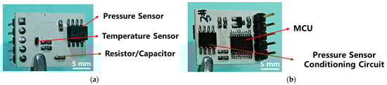 The microcontroller, signal conditioning chip, pressure and temperature sensors, resistors, capacitors, and other components are then assembled through a reflow soldering process. Additionally, the pins or wiring for signal transmission are soldered to complete the integrated sensors. As shown in Figure 4, the integrated sensors feature a double-sided design, with the pressure and temperature sensors on the front side (Figure 4a) and the microcontroller and signal conditioning chip on the back side (Figure 4b). The metal electrode circuit is embedded within the ceramic substrate, thereby avoiding the risk of surface electrodes being affected by corrosive electrolyte immersion.