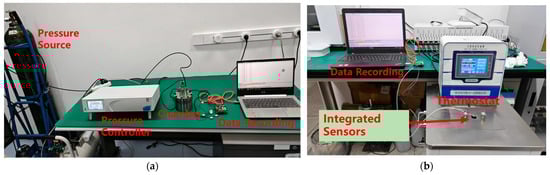 For the pressure test, a standard air pressure controller (WIKA, CPC4000, Klingenberg, Germany) is used to generate a reference air pressure as the set value. The test setup is shown in Figure 5a. The sensor is placed in a test fixture consisting of a sealed gas chamber and an aviation connector. The aviation connector ensures both electrical connectivity and airtightness, while the sealed chamber maintains the stability of the set pressure. The pressure test range of the sensor is from 90 kPa to 1 MPa absolute pressure. This range covers the slight negative pressure inside the battery due to temperature fluctuations and the pressure increase caused by gas generation during battery operation. The test points are set to sample at intervals of 100 kPa. Each test point is held for 5 min to ensure that the set pressure and sensor readings are stable. During the test, the system is first pressurized at both the lower and upper pressure limits (0 kPa and full scale), followed by pressure cycling, according to the set step value. The process is repeated three times, and the data are recorded. The static performance is then calculated using the method outlined in Section 2.4, which includes parameters such as repeatability, non-linearity, accuracy, and hysteresis.