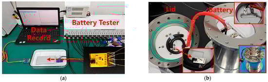 To verify whether the sensor can detect pressure/temperature changes during battery operation, as well as the sensor’s endurance to the internal environment of the battery, the sensor is implanted into a pouch-type lithium iron phosphate (LiFePO4) battery and a simulated cylindrical battery, respectively. The battery used has a capacity of 12 ampere-hours and dimensions of 120 mm × 80 mm × 10 mm. Figure 6a shows a photograph of the sensor implanted inside the pouch-type battery and undergoing a cycle charge–discharge test. The sensor is protected with polyimide tape for insulation. The implantation of the sensor is completed in an argon-protected glovebox, and the battery is sealed with adhesive. After the adhesive is fully cured, the sensor-implanted battery is connected to a lithium-ion battery charge–discharge tester (DEKANG DT50W-17, Hangzhou, China) for 100 charge–discharge cycles, with a charge/discharge rate of 0.5C and a rest period of 0.5 h between cycles. Simultaneously, the sensor is activated to collect and record internal pressure and temperature variations during the battery’s charge–discharge process.