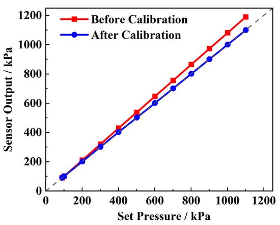 Figure 7 presents the static performance test curve of the pressure sensor and the sensor performance after linear calibration. It can be observed that, as the applied pressure increases, the deviation of the pressure sensor’s output becomes more significant, with the overall output exceeding the true value. The calculated overall error over the full range is 7.45%. The sensor exhibits excellent linearity and accuracy, with a non-linearity of 0.092%, a repeatability deviation of 0.067%, and a fitting R2 of 0.99. This allows for a significant improvement in accuracy through linear correction. Using the least squares fitting method, the calibration Equation (18) is derived, and the linear correction Equation (19) is subsequently obtained. After correction, the comprehensive error is reduced by two orders of magnitude, reaching ±0.085%, with a resolution of 1 kPa, demonstrating excellent pressure sensing performance.