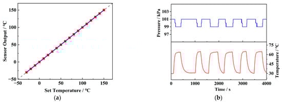 Figure 8a illustrates the static performance test curve for the temperature response of the sensor. It shows a high resolution of 0.1 °C within the range of −30 °C to 150 °C and a rapid response time of 0.21 s. The sensor also exhibits high accuracy, with a comprehensive error of ±0.15%, allowing for precise temperature measurement without additional correction. Figure 8b shows the temperature drift test curve of the pressure sensor, with an output attenuation of about 2 kPa, as the temperature rises from room temperature to 65 °C. This attenuation can be attributed to the increased lattice vibrations in silicon at higher temperatures, which reduce the modulation effect of stress on carrier mobility and decrease the piezoresistive coefficient []. Nevertheless, the sensor exhibits excellent repeatability during multiple heating and cooling cycles, allowing for temperature drift correction through test data, thus maintaining good accuracy over a wide temperature range. Since the internal pressure and temperature often change simultaneously during battery charge and discharge cycles, it is crucial for the pressure sensor to maintain accuracy under temperature variations. Table 1 summarizes the static performance of the sensor after correction.