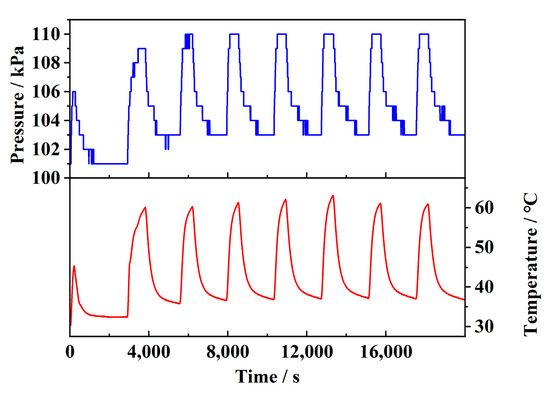 The correction factor is determined experimentally. Figure 9 illustrates the pressure variation caused by temperature changes in a closed environment, with seven cycles performed. The relationship between pressure and temperature was analyzed using the method of linear fitting. The result shows that the data approximately follow a linear trend, with an R2 value of 0.95, consistent with Equation (20).