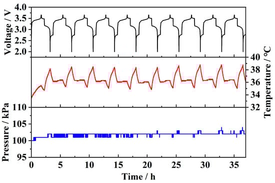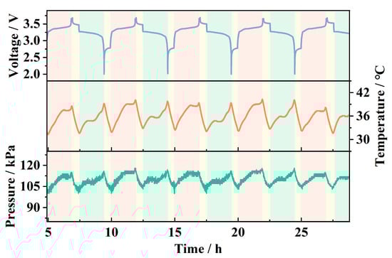 Figure 6b shows a photograph of the sensor implanted inside a prototype battery undergoing charge–discharge cycle testing. The prototype battery consists of a metal canister with a sealing lid and an aviation plug on the lid, designed to simulate the structure of a cylindrical battery. During the test, a pouch-type battery identical to that in Figure 6a is used and cut open in an argon-protected glovebox, and the battery is placed inside the canister. The positive and negative terminals are connected via the aviation plug for charge–discharge testing. The sensor is implanted in the gap between the canister lid and the battery cell, with power and data transmission facilitated through the aviation plug. Once assembled, the canister and lid are sealed, and the battery undergoes 100 charge–discharge cycles with a charge rate of 0.6C and a discharge rate of 1C. Simultaneously, the sensor is activated to monitor and record the internal pressure and temperature variations during the charge–discharge process.