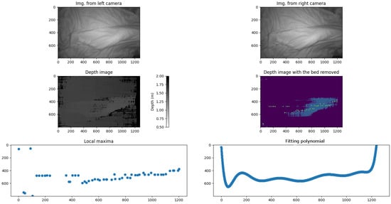 In the practical application of our structured light system, the process is further refined by fitting a second-degree polynomial (using the polyfit method of the Python NumPy library) to the set of the extracted maxima. This polynomial fitting allows for a smooth approximation of the leg profile while mitigating minor noise and projection irregularities. The concavity or convexity of the fitted curve is then evaluated, enabling a precise classification of whether the patient is lying on their left or right side.