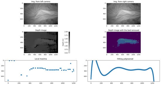 This calibration process was critical for achieving accurate 3D reconstruction. Errors in positioning and orientation directly affect the accuracy of height estimations obtained from the structured light deformation. In particular, small misalignments can introduce errors in the extracted contour lines, impacting the detection of a person’s posture. The iterative refinement of the system mitigated these errors, ensuring the reliability of the method for its intended application in monitoring bedridden patients.