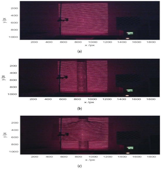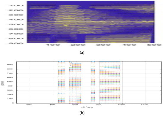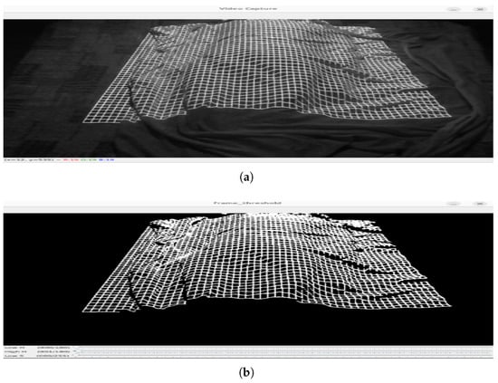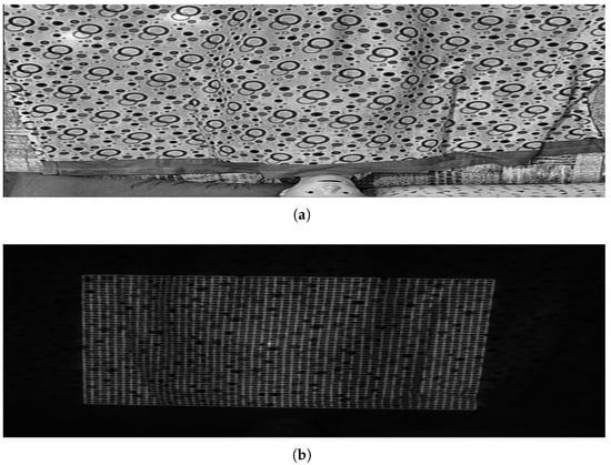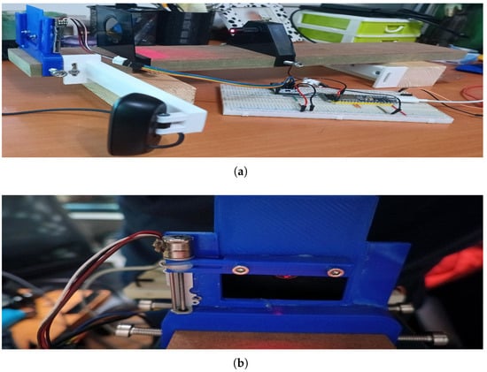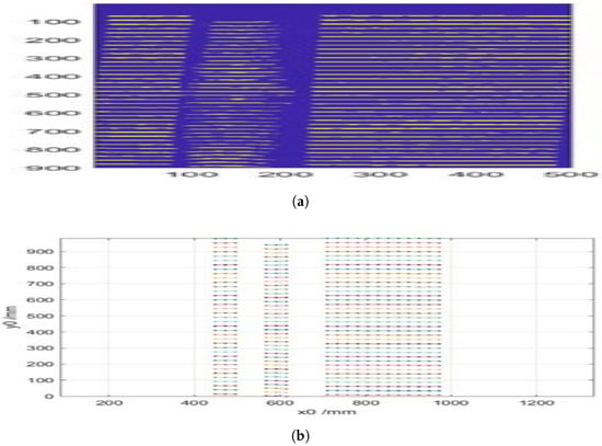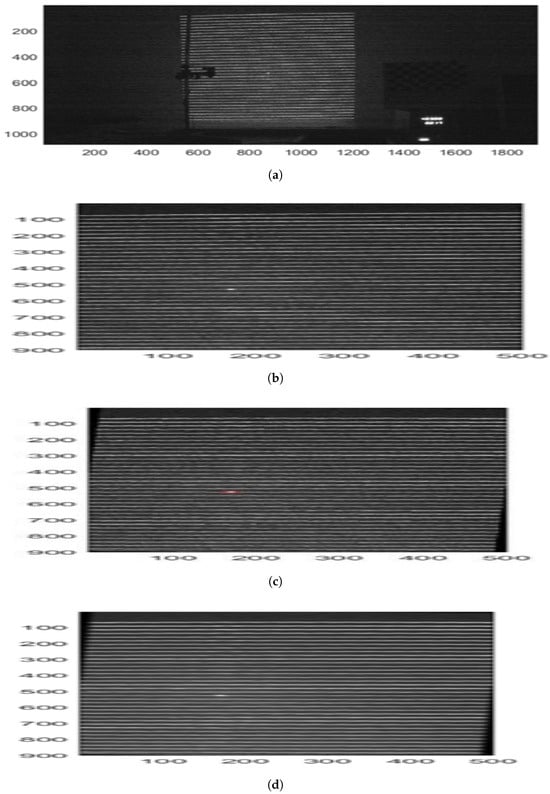 Figure 15a,b, the lines in this area were too close together, making precise detection difficult due to the relative position of the bed with respect to the laser assembly. This clustering compromised the system’s ability to distinguish individual projections, potentially affecting the accuracy of measurements in this area. To address this issue, the laser was kept in its initial position but the camera was relocated directly above the bed (