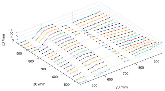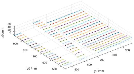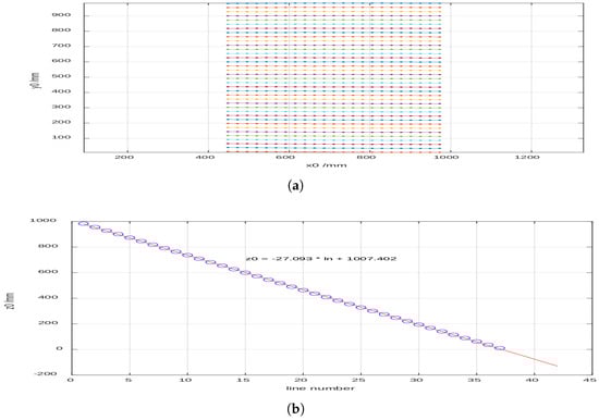 Figure 7b). For non-flat surfaces, the vertical displacement of each line was calculated, and, combining these data with the horizontal and vertical displacement ratio, the three-dimensional coordinates relative to the reference surface were obtained. However, it was observed that the precision decreased as the value of