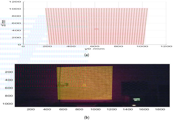 Figure 8a). The next step was to compute the intersection of the projected stripes with the wall plane and to fine tune the projector’s orientation so that the detected line positions matched the laboratory measurements. Finally, the projected lines’ detected positions in the camera image were extracted and superimposed onto the real image for validation (