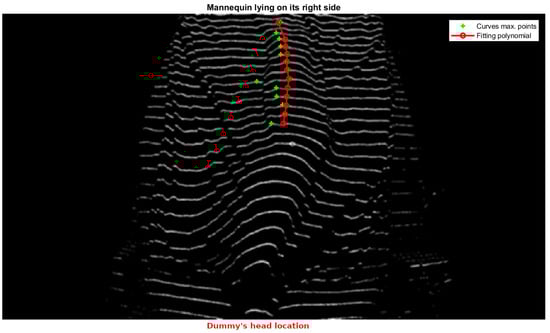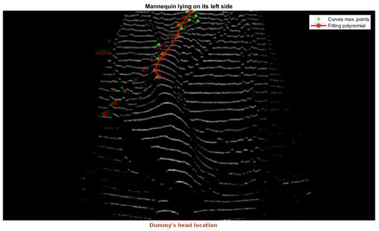 In both images, green crosses mark the extracted maximum points from each projected line in the leg region, while the red curve represents the fitted polynomial derived from these maxima. As observed, the curvature of this polynomial—whether concave or convex—directly indicates the mannequin’s lateral posture, demonstrating the effectiveness of our method. Based on this orientation,
