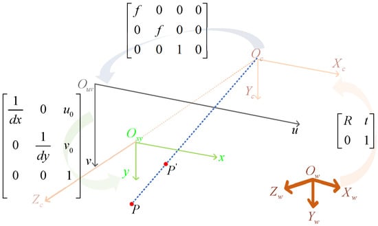 where is the element in the i-th row and j-th column of the projection matrix of camera c, represents the spatial coordinates of point P, and considering the influence of camera distortion, the pixel coordinates are the values after distortion correction [30]. Expanding the above formula yields the following system of equations: