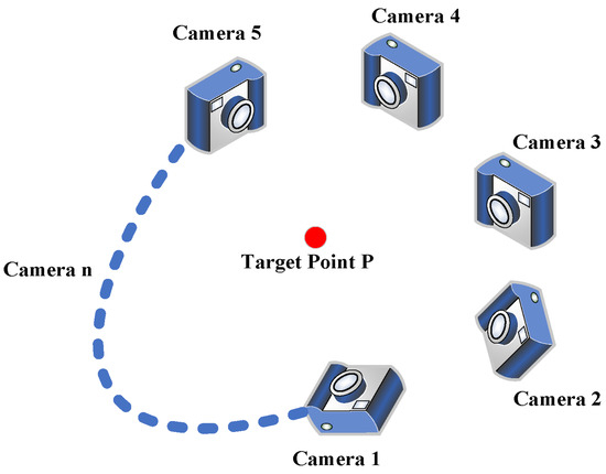 Multi-camera vision measurement is a 3D reconstruction method based on triangulation principles. Its core idea is to observe the same target from different viewpoints using two or more cameras and to reconstruct the target’s 3D spatial information by combining known camera parameters and image matching technology. For a multi-camera vision system composed of n cameras (as shown in Figure 2), assuming all cameras simultaneously capture a spatial target point P, for the c-th camera, the pixel coordinates of point P satisfy Equation (1), as follows: