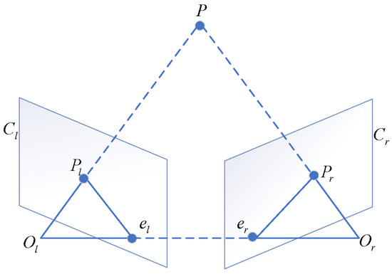 As shown in Figure 4, for a spatial point P in the binocular camera system, its imaging points are and , respectively ( and are corresponding points), with camera optical centers and . If the extrinsic parameters of the two cameras are known as , and , , then the 3D spatial coordinates can be converted to coordinates and in their respective camera coordinate systems via the following formula: