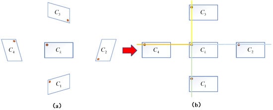Using the coordinate system of camera as the reference coordinate system, the two equations in Equation (7) can be solved simultaneously to obtain the rotation matrix and translation vector of camera relative to camera , as follows: