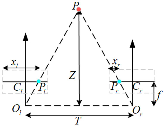 As shown in Figure 7, for a spatial point P and its projections and in the binocular camera system, the relationship between depth Z and disparity can be established based on the principle of similar triangles. For the rectified image pair, and are the imaging points (corresponding points) of point P on the left and right image planes, respectively. The perpendicular distance from point P to the binocular baseline is denoted as Z. The principal points of the left and right cameras are and , respectively, and and are the horizontal coordinates of image points and on the left and right camera planes. f is the focal length of the cameras, which is the same for both cameras after rectification, and T is the baseline length. According to the principle of similar triangles, we have
