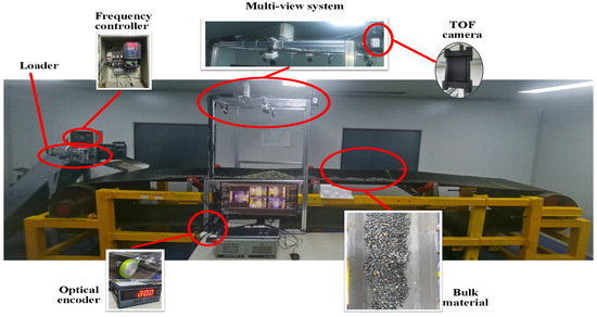 As shown in Figure 8, the laboratory conveyor system consists of a conveyor belt with a width of 0.8 m and a total length of 12 m. The conveyor uses three-trough idlers, with a distance of 0.78 m between the vertex points of the side idlers. The conveyor belt running speed can be adjusted through a frequency converter, with a maximum safe operating speed of 2 m/s. The system is equipped with traditional contact speed sensors (optical encoder) to measure the conveyor belt speed in real time. The proposed multi-camera system is mounted on the conveyor using a frame structure. Additionally, a TOF camera is installed on the system for comparative experiments.