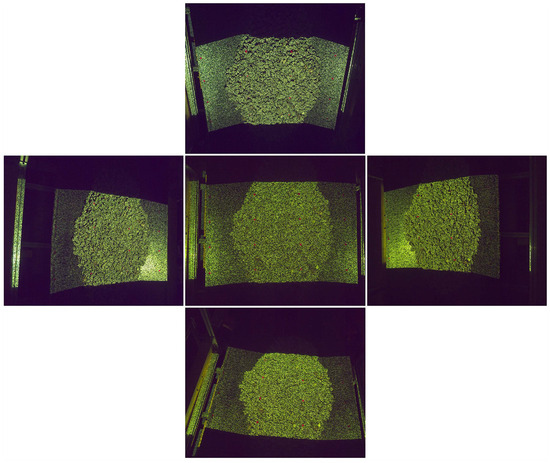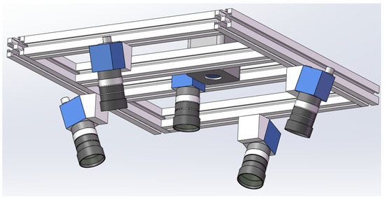 In this study, considering the spatial constraints of the laboratory transportation system and the calibration complexity of the multi-camera, five cameras of the same model and configuration are used for image acquisition and 3D reconstruction, with a projector serving as the speckle structured light source. The deployment design of the cameras and projector is shown in Figure 9. To enhance the surface features of the measured bulk materials, speckle structured light is projected onto the surface of the target object using the projector, and images are captured simultaneously by the five cameras. The images captured by the five cameras show complete overlap of the conveyor belt and bulk materials. As seen in Figure 9, the core camera is positioned directly above the center of the conveyor system, while the other four non-core cameras are evenly distributed around the core camera at 90° intervals. The optical axes of the four non-core cameras are tilted toward the optical axis of the core camera. The projector, used to emit speckle structured light, is located beside the core camera. The tilt angles of the non-core cameras are adjustable, ensuring that the overlapping fields of view of the four cameras and the core camera fully cover the upper conveyor belt of the system, enabling complete 360-degree information acquisition of the bulk materials on the horizontal plane.
