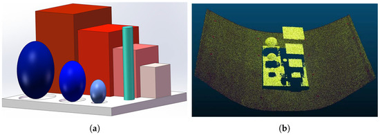 To test the accuracy of the proposed multi-camera vision 3D reconstruction method, a calibration module with multiple geometric features was designed. As shown in Figure 12a, the calibration module mainly consists of a base, four cubes of different sizes, three spheres of different diameters, and a cylinder. The base measures mm, the four cubes have edge lengths of 100 mm, 80 mm, 60 mm, and 40 mm, respectively, the three spheres have diameters of 70 mm, 50 mm, and 30 mm, respectively, and the cylinder has a diameter of 20 mm and a height of 90 mm. The calibration module was fabricated using 3D printing, with a module precision of ±0.2 mm. The calibration module was placed on the conveyor belt, and the proposed multi-camera vision 3D reconstruction method was used to generate the point cloud of the module, as shown in Figure 12b. The point cloud software CloudCompare (V 2.13.2) was used to segment and fit the geometric features in the point cloud, measuring the dimensions of each geometric feature. The experimental results of the accuracy test are shown in Table 2.