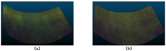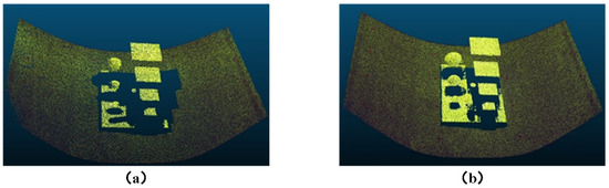 To comprehensively evaluate the performance of the proposed multi-camera 3D reconstruction method, comparative experiments were conducted with an industrial TOF camera. The TOF camera used in the experiment is the OI-G1480-R (Odos Imaging, Edinburgh, Scotland), with a resolution of 640 × 480, a field of view of , and a maximum measurement distance of 6 m. The TOF camera was used to capture the calibration module, and the directly acquired point cloud image is shown in Figure 17.
