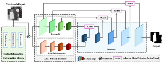 The SDA-Net, as illustrated in Figure 1, started with a Spatial Information Optimization Module (SIOM) which refines and aligns the multi-modal features through modulation, decomposition, and reassembly. The SIO initially modulates the multi-modal features from a multi-scale perspective, followed by the decomposition and reassembly of informative and non-informative features. This process enhances effective information and suppresses noise, thereby better aligning multi-modal features in the spatial dimension. The refined features are then input into the Dual-Stream encoder, which integrates ResNet50 [49] and axial self-attention [50] mechanisms in parallel. The axial self-attention mechanisms model global contextual information and extract complementary features from multi-modal data with less computational cost, while ResNet50 is focused on preserving the spatial details, compensating for any spatial loss that may arise from the self-attention mechanism. In the decoding phase, a progressive fusion strategy of encoder and decoder features is proposed, guided by the Adaptive Global Attention Fusion Module (AGAFM), to adaptively balance global and local multi-modal features. In AGAFM, the Adaptive Global Feature Adjuster (AGFA) is introduced to enable adaptive weighting and capture global dependencies effectively, thereby facilitating precise feature fusion at a fine-grained level. The fused features are gradually upsampled to the original image size, resulting in the final building extraction results.