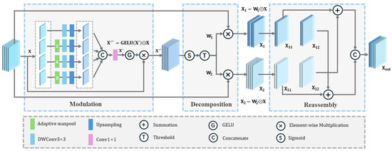 In the decomposition stage, the importance of each spatial position is measured based on the grayscale distribution of the modulated features . first passes through a Sigmoid activation function, mapping into the range [0, 1]. Based on a gating threshold T, the information-rich and informative-poor weight matrices and are generated. As shown in Formulas (2) and (3).