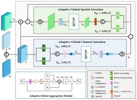 To more effectively guide encoder–decoder feature fusion, bridge the semantic gap in multi-scale multi-modal features, and optimally balance global–local information, we propose an Adaptive Global Attention Fusion Module (AGAFM). As shown in Figure 3, AGAFM is a cascaded spatial-channel attention mechanism that incorporates the Adaptive Global Aggregation Module (AGAM) during attention weight computation, endowing spatial and channel attention weights with genuine global contextual information. The sufficient aggregation of global information enables more effective semantic alignment and multi-modal alignment, thereby enhancing feature fusion efficacy.