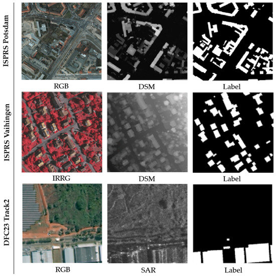 The ISPRS Vaihingen dataset [53] consists of 33 true orthophoto (TOP) images with a spatial resolution of 9 cm. The experiment incorporates multi-spectral data comprising near-infrared, red, and green bands (IRRG) alongside corresponding digital surface models (DSMs). The dataset encompasses the same classes as Potsdam dataset, and our experiments also focus on class building.