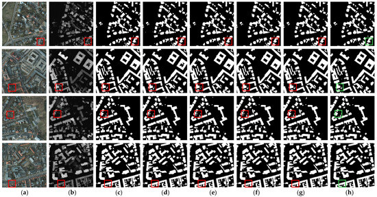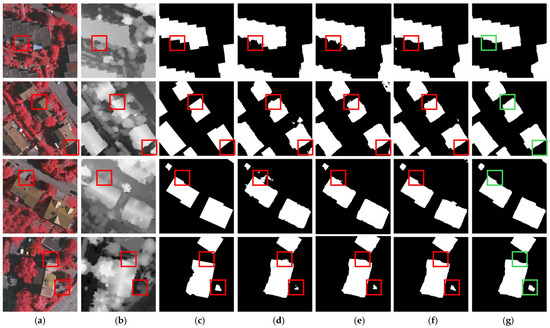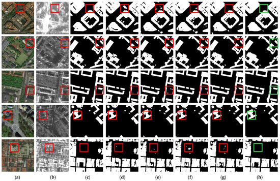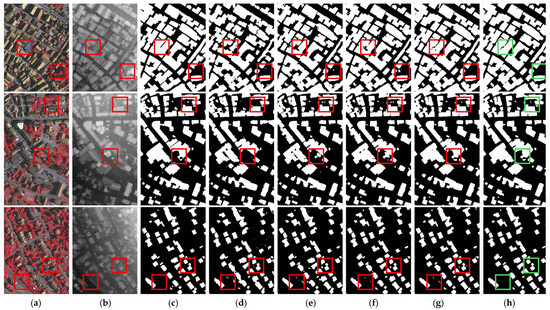 The visualization results of the ablation experiments are presented in Figure 11. As shown in Figure 11d,e, the adoption of the Dual-Stream encoder enables more accurate extraction of building contours compared to the standalone axial self-attention encoder. After introducing SIOM, effective suppression of noise in multi-modal data are achieved, as demonstrated in the first and second rows (e) and (f). Finally, the progressive application of the AGAFM dynamically bridges semantic gaps and optimizes the balance between global and local information, generating high-fidelity fused features with enhanced discriminative power for precise extraction of detailed building features, as shown in the third and fourth rows (f) and (g).