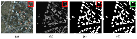 As shown in Figure 8, we analyzed a typical error case where the model incorrectly identifies shadowed regions as the background (boxed area). The primary causes are twofold: (1) texture feature degradation in RGB imagery due to shadow occlusion, which obscures critical roof surface details, and (2) ambiguity in DSM-based elevation features, where the shaded slope of inclined roofs exhibits bright patterns overlapping with low-elevation objects under elevation rendering algorithms. The root cause lies in the model’s inability to effectively reconcile texture loss in RGB imagery with elevation continuity in DSM, resulting in insufficient feature representation for shadowed regions. To address this issue, the improvement strategies include establishing a cross-modal compensation mechanism to enhance the model’s ability to recognize shadowed regions. Additionally, introducing geometric rule constraints further improves the recognition accuracy of shadowed areas. These methods effectively mitigate feature confusion caused by shadows and significantly enhance the robustness and accuracy of building extraction.
