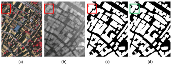 Failure case of the ISPRS Vaihingen dataset. (a) IRRG images. (b) DSM images. (c) Labels. (d) SDA-Net.