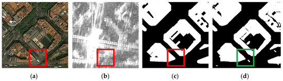 As shown in Figure 6, a typical failure case is demonstrated. In the boxed area, the model fails to detect low-rise buildings with textures similar to their surroundings in optical imagery, primarily due to the loss of fine-grained features and insufficient capability to learn subtle spatial–spectral variations. During feature extraction, the model tends to overlook small-scale or low-contrast details, especially when targets share similar spectral and textural characteristics with their backgrounds. This indicates that our current approach still suffers from insufficient multi-scale feature fusion capability, where local details are often overwhelmed by dominant background patterns. An improved direction is to incorporate feature disentanglement techniques, such as wavelet transforms, to enhance local feature extraction by explicitly separating high-frequency details from low-frequency contextual information, thereby addressing the limitations of existing methods in preserving fine-grained structures.