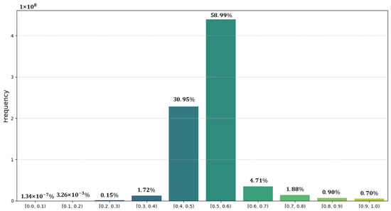 To better illustrate the selection of the threshold T in the SIOM, we statistically analyzed the numerical distribution of pre-classification weights, as shown in the histogram in Figure 12. The results reveal that the majority of weight values (89.94%) are concentrated within the interval [0.4, 0.6], while values below 0.2 or above 0.8 are extremely sparse. This implies that setting T in these peripheral regions would result in nearly all data being categorized into a single class, effectively disabling the SIOM. Consequently, experiments were conducted across T ∈ [0.3, 0.8] to systematically evaluate the impact of T on model performance, with results summarized in Table 5.