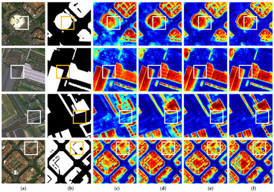 To better visualize the feature fusion effect, intermediate features were extracted during testing and presented as heatmaps in Figure 13. The first and second rows demonstrate that it is evident that the feature fusion guided by AGAFM restores the most accurate contour structures. In the third row, it is notable that the high-frequency features with interference have been effectively suppressed. The fourth row showcases regions with complex backgrounds, where the AGAFM fusion successfully focuses on the fine-grained building features. AGAFM balances semantic discrepancies during multi-scale cross-modal feature fusion through flexible attention, selectively leveraging different features to complement each other. This approach not only prevents excessive interference from high-frequency information on global features but also avoids the overshadowing of key structural contour features by global information. This capability enhances the model’s performance in building extraction tasks, enabling more precise and reliable results even in challenging environments.
